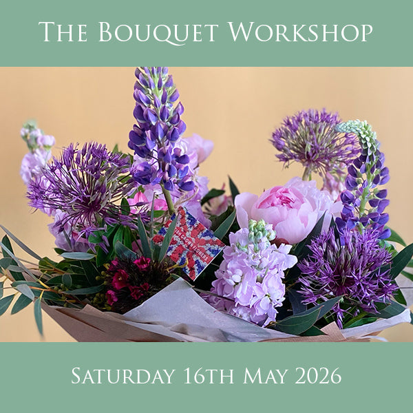 Learn to create a fabulous handtied bouquet using spring flowers on our special spring bouquet workshop. We have a fabulous choice of flowers in the early spring months and this lavish design will use some of our early summer favourites that you can find in your own garden or at a local grower. Varieties such as Stocks, Lupins and of course Peonies! We also show you how to support your flowers and then wrap as the perfect gift and add just the right vase for you to display at home (which you get to keep!).